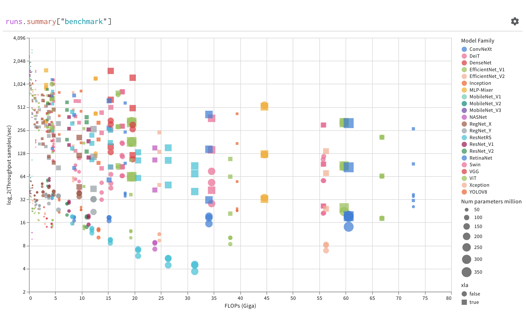 쿼리 패널을 사용하여runs 오브젝트에 엑세스합니다. Run 오브젝트는 Experiments 기록을 저장합니다. 이 섹션의 리포트에서 자세한 내용을 확인할 수 있지만, 간략하게 살펴보면 runs 오브젝트는 다음과 같습니다.